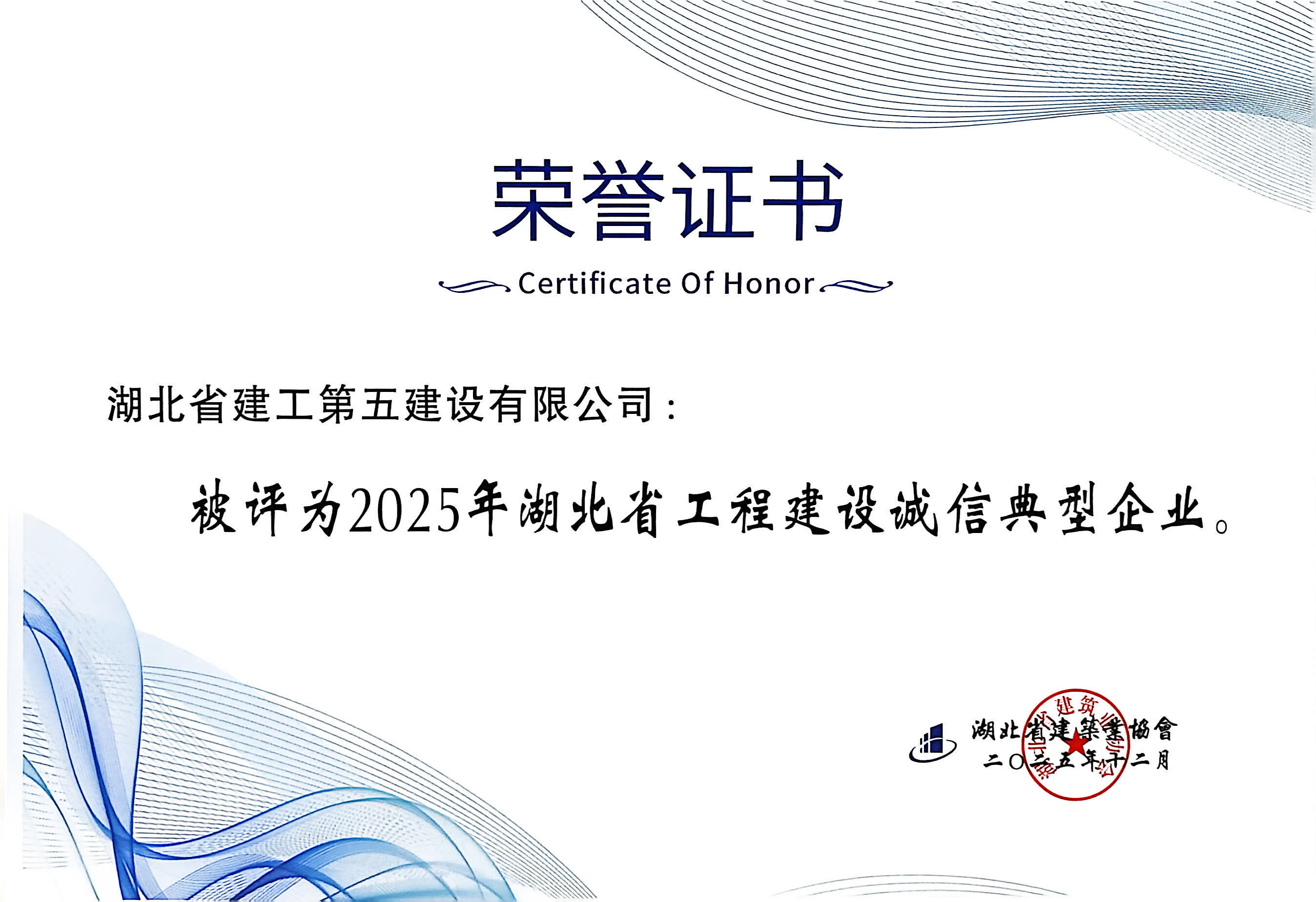 • 2025-12-29湖北省建工第五建設有限公司榮膺省級“工程建設誠信典型企業” 獲得AAA級...[]